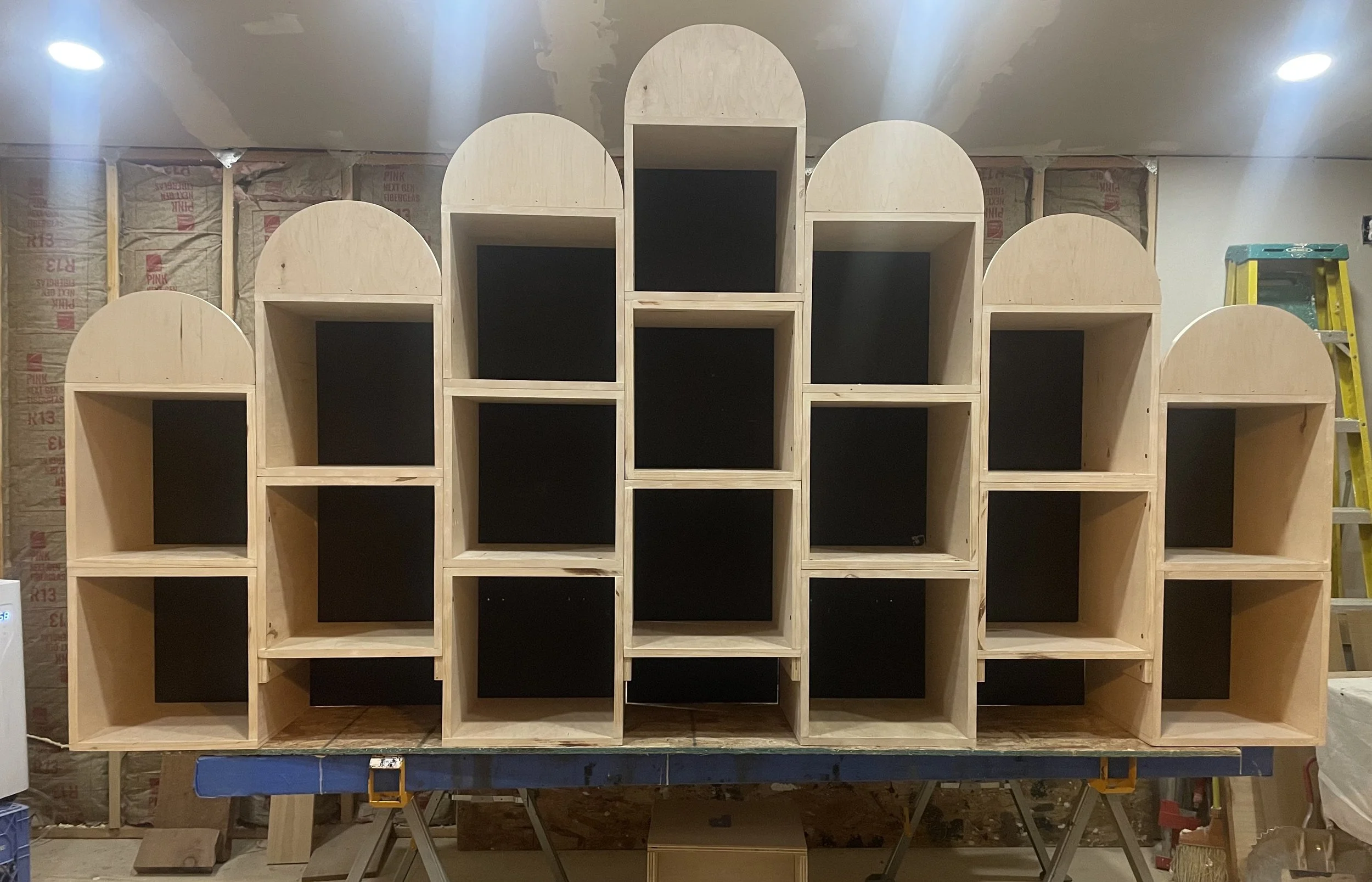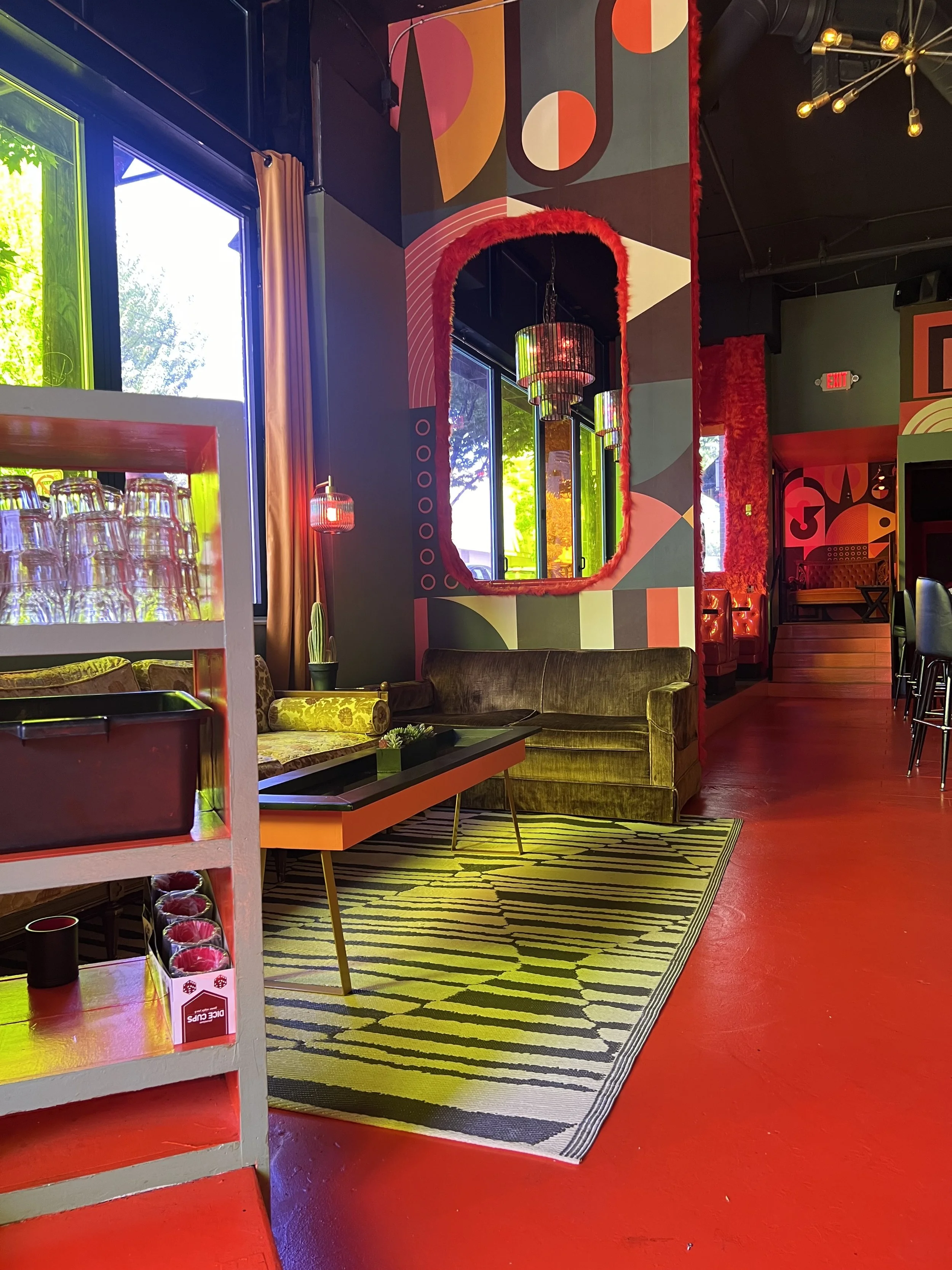 BUILDS SALON STATIONS SALON STATIONS BACKROOM SEATING COCKTAIL BACKBAR PEEK-A-BOO CUTOUT COCKTAIL BACKBAR STEEL SIGN